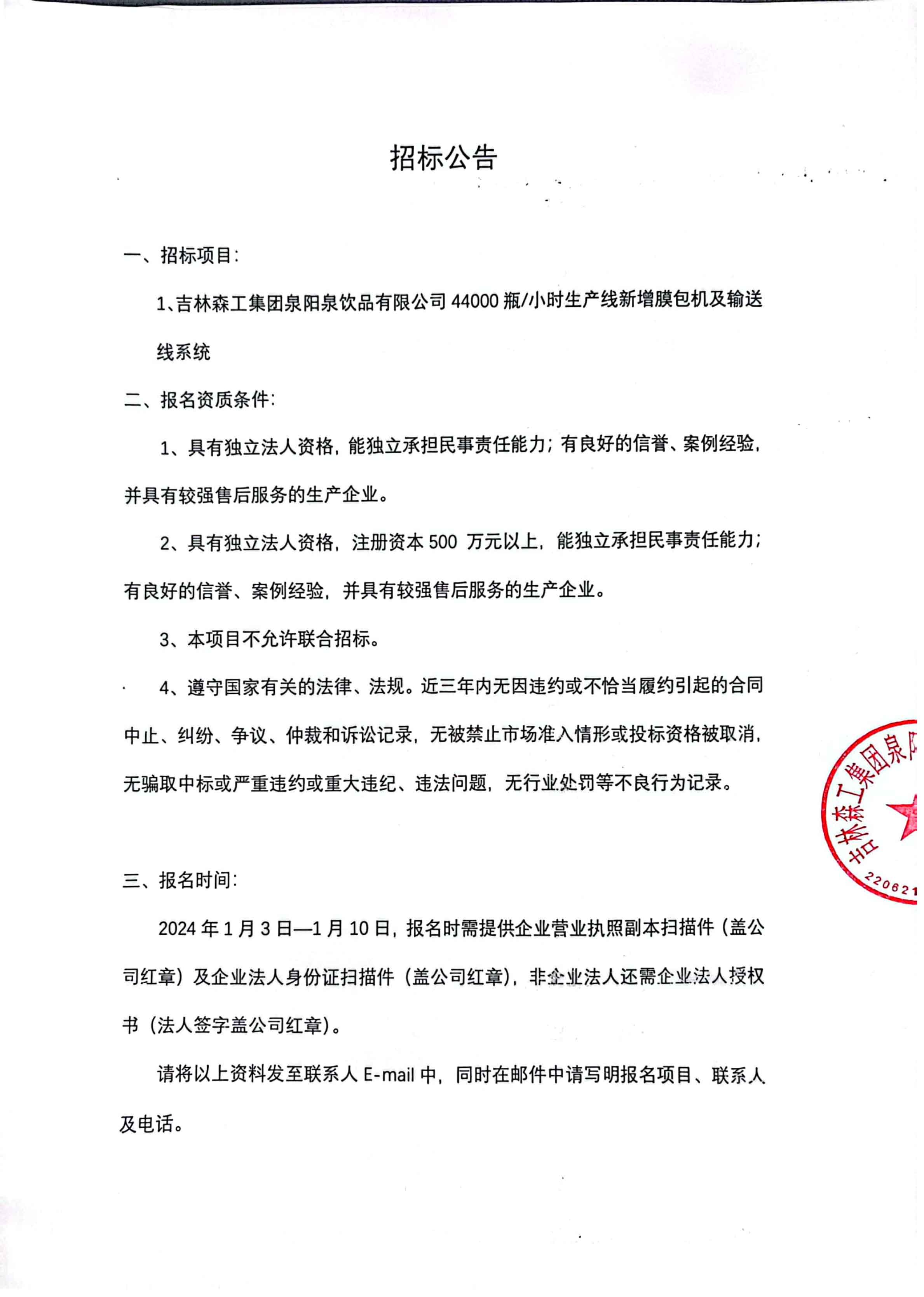 44000生產(chǎn)線新增膜包機(jī)招標(biāo)公告